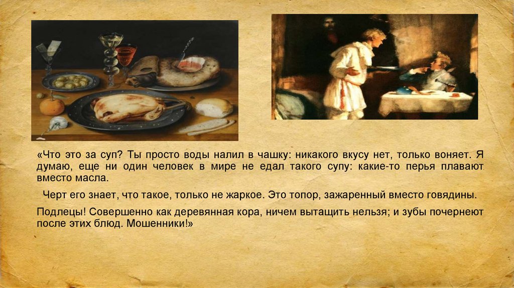 «Что это за суп? Ты просто воды налил в чашку: никакого вкусу нет, только воняет. Ядумаю, еще ни один человек в мире не едал такого супу: какие-то перья плавают
