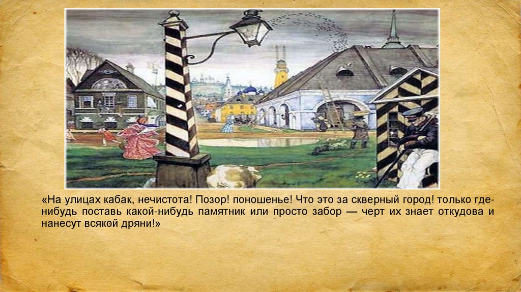 «На улицах кабак, нечистота! Позор! поношенье! Что это за скверный город! только гденибудь поставь какой-нибудь памятник или просто забор — черт их знает откудова инанесут всякой дряни!»