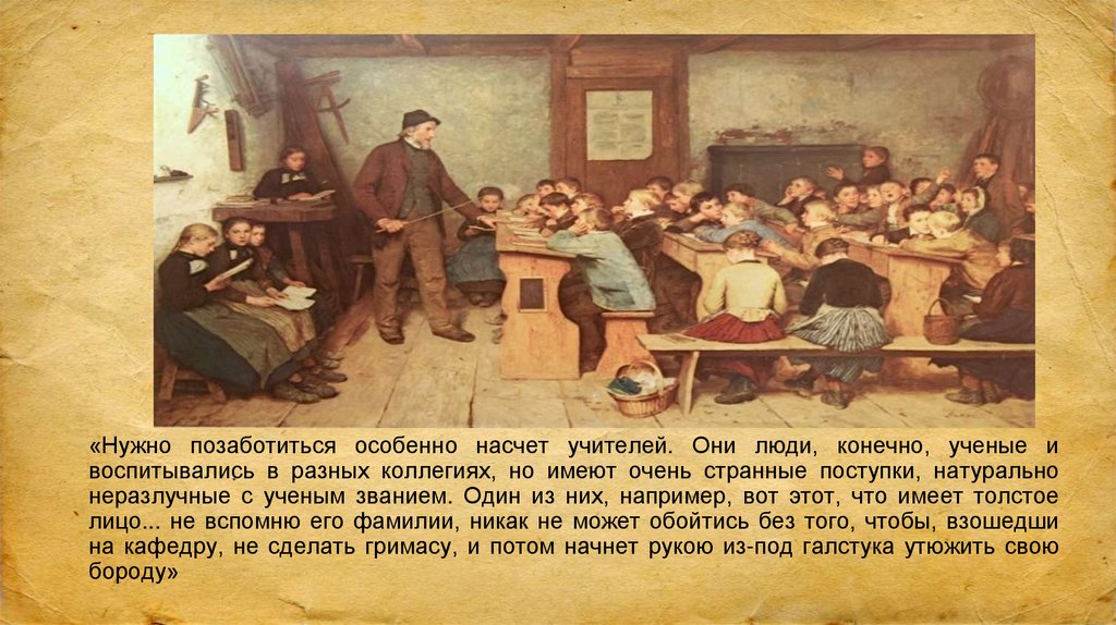 «Нужно позаботиться особенно насчет учителей. Они люди, конечно, ученые ивоспитывались в разных коллегиях, но имеют очень странные поступки, натурально