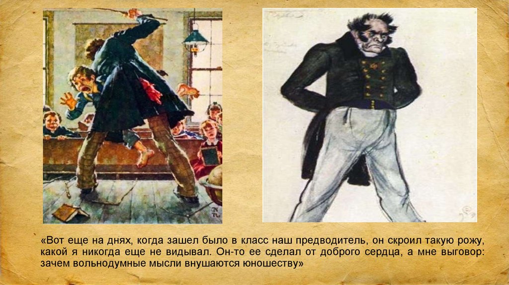 «Вот еще на днях, когда зашел было в класс наш предводитель, он скроил такую рожу,какой я никогда еще не видывал. Он-то ее сделал от доброго сердца, а мне выговор: