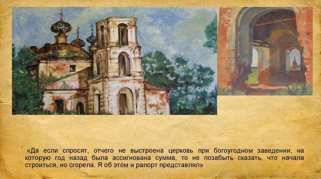 «Да если спросят, отчего не выстроена церковь при богоугодном заведении, накоторую год назад была ассигнована сумма, то не позабыть сказать, что начала