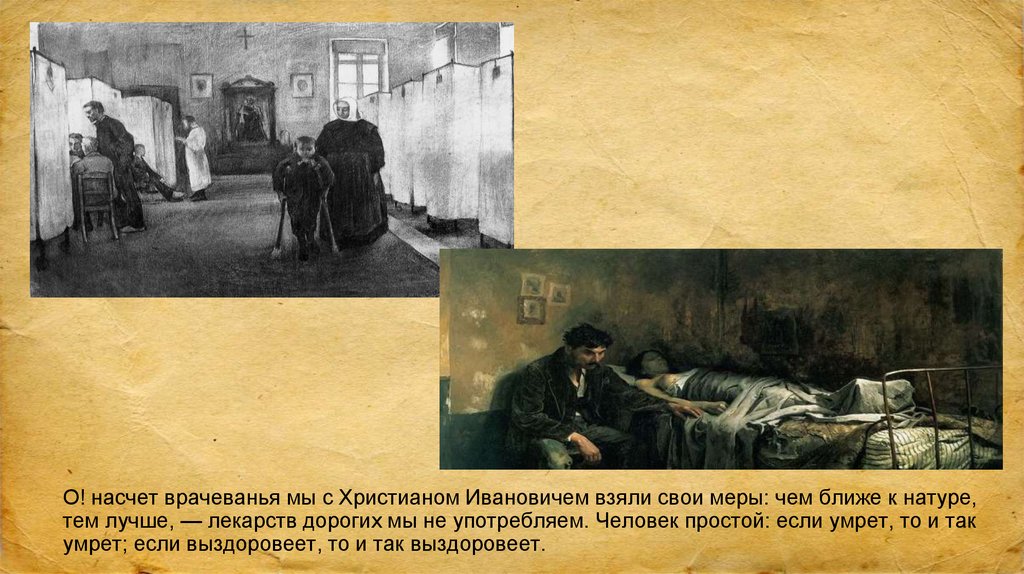 О! насчет врачеванья мы с Христианом Ивановичем взяли свои меры: чем ближе к натуре,тем лучше, — лекарств дорогих мы не употребляем. Человек простой: если умрет, то и так