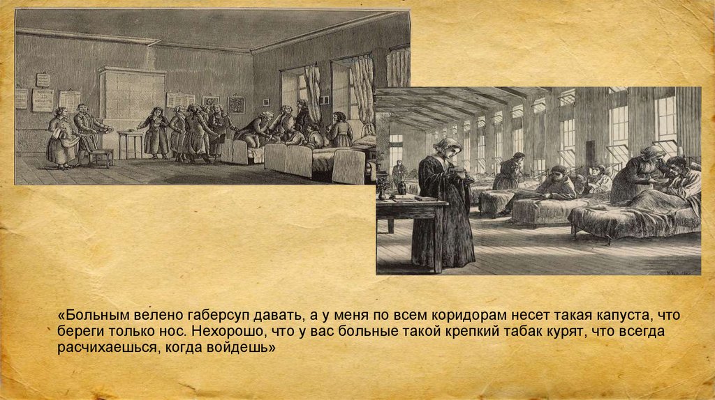 «Больным велено габерсуп давать, а у меня по всем коридорам несет такая капуста, чтобереги только нос. Нехорошо, что у вас больные такой крепкий табак курят, что всегда