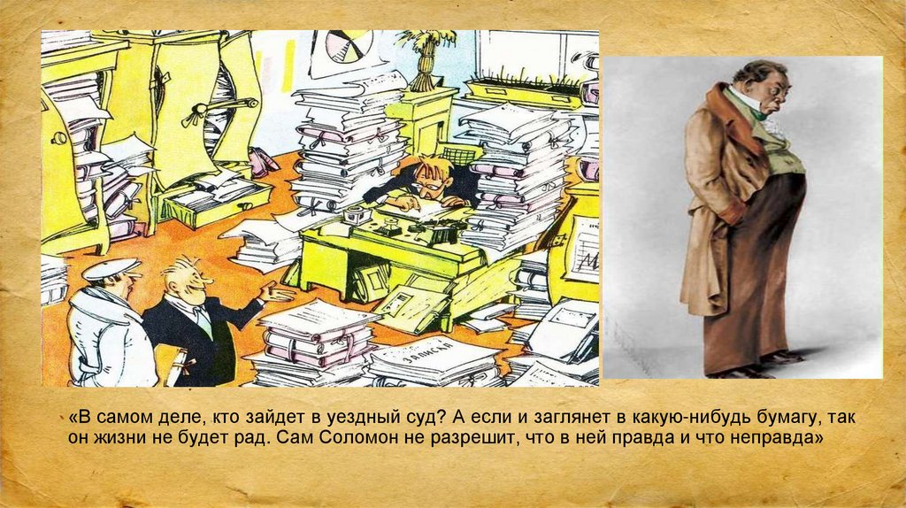 «В самом деле, кто зайдет в уездный суд? А если и заглянет в какую-нибудь бумагу, такон жизни не будет рад. Сам Соломон не разрешит, что в ней правда и что неправда»
