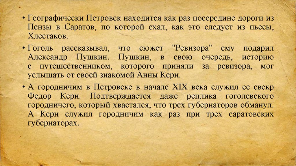 • Географически Петровск находится как раз посередине дороги изПензы в Саратов, по которой ехал, как это следует из пьесы,