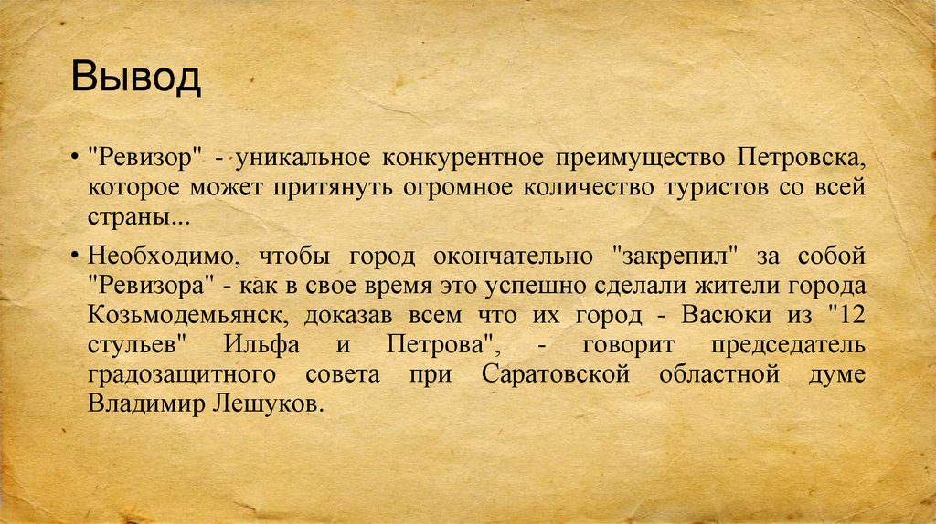 Вывод• "Ревизор" - уникальное конкурентное преимущество Петровска,