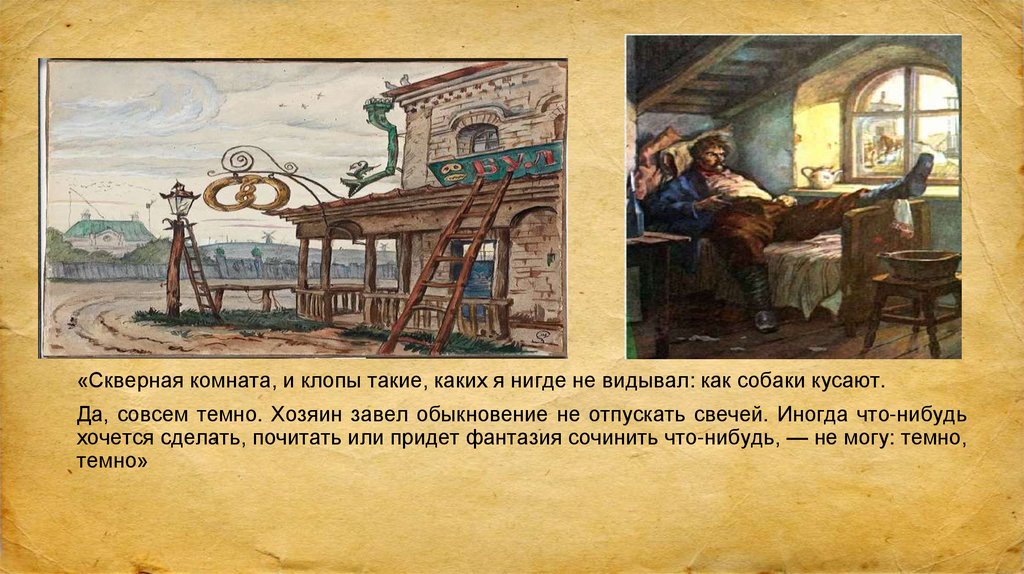 «Скверная комната, и клопы такие, каких я нигде не видывал: как собаки кусают.Да, совсем темно. Хозяин завел обыкновение не отпускать свечей. Иногда что-нибудь
