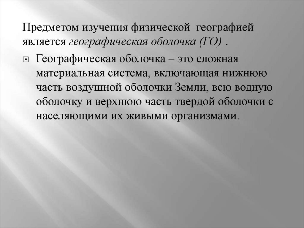 Предметом изучения физической географиейявляется географическая оболочка (ГО) .