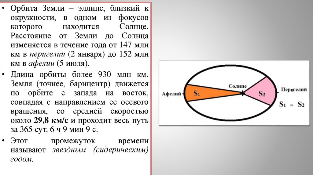• Орбита Земли – эллипс, близкий кокружности, в одном из фокусов