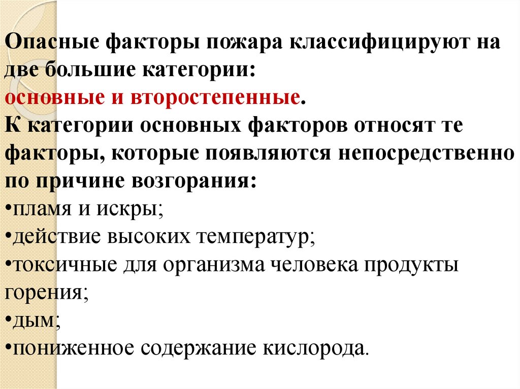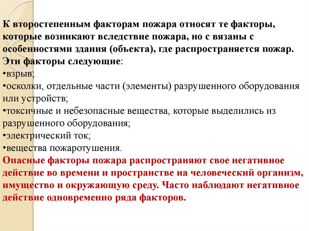 К второстепенным факторам пожара относят те факторы,которые возникают вследствие пожара, но с вязаны с