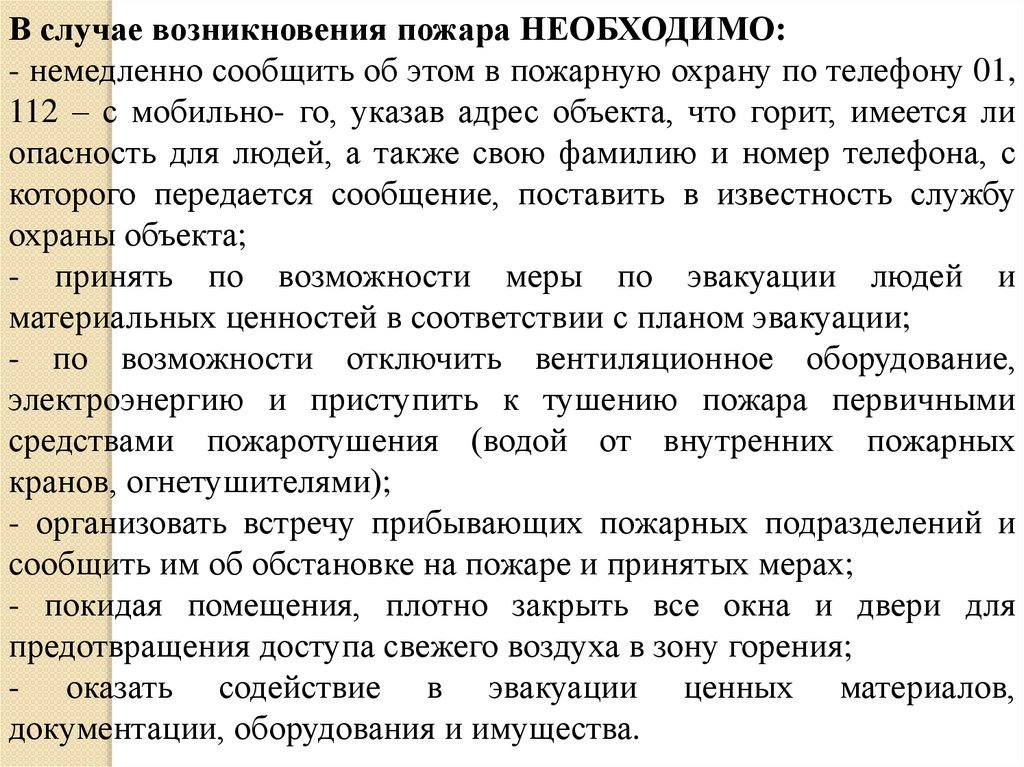 В случае возникновения пожара НЕОБХОДИМО:- немедленно сообщить об этом в пожарную охрану по телефону 01,