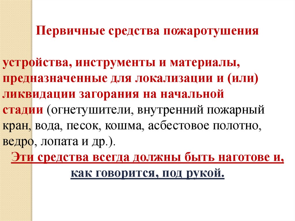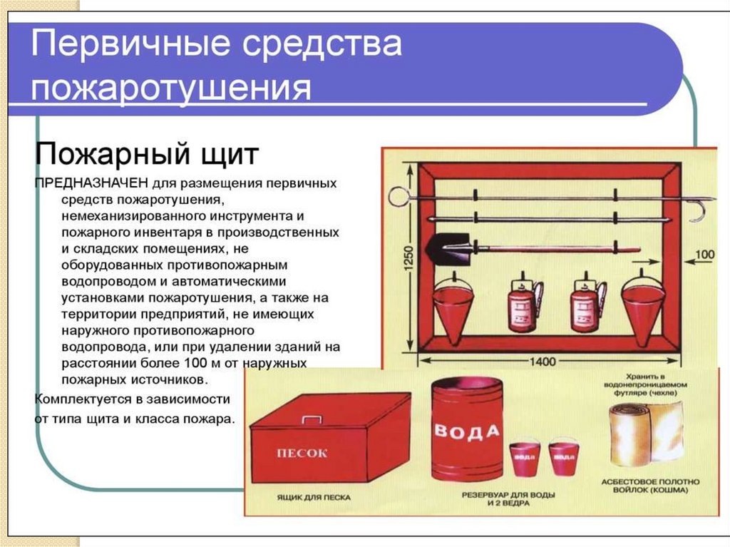 Первичные средства пожаротушенияустройства, инструменты и материалы,