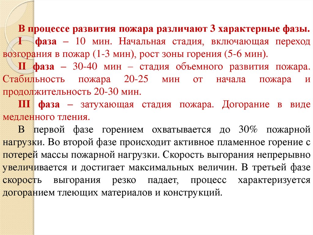 В процессе развития пожара различают 3 характерные фазы.I фаза – 10 мин. Начальная стадия, включающая переход