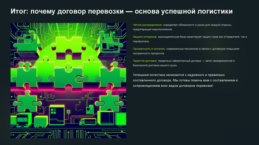 Итог: почему договор перевозки — основа успешной логистикиЧеткое распределение: определяет обязанности и риски для каждой стороны,