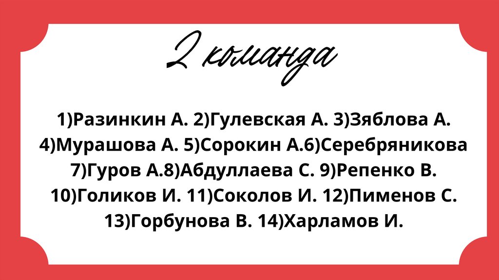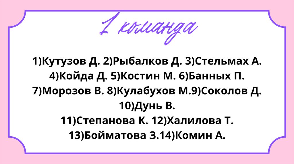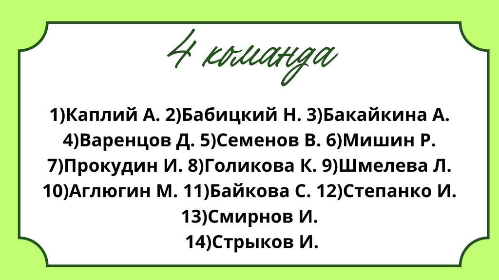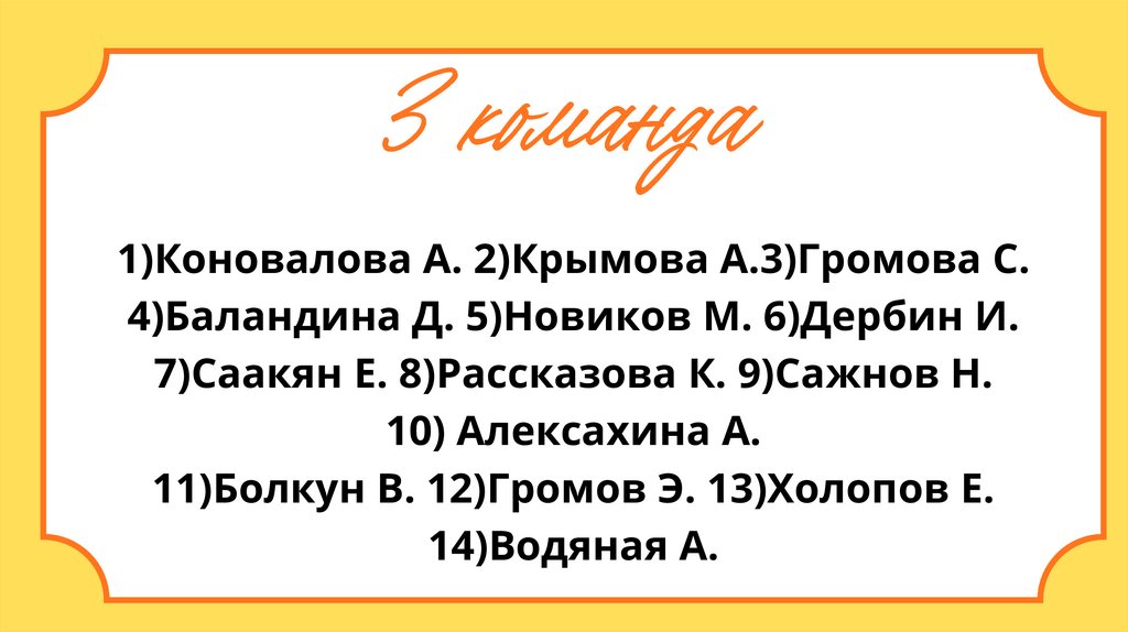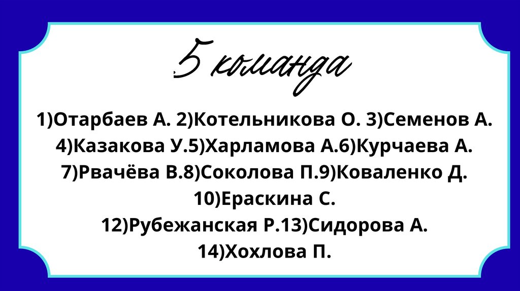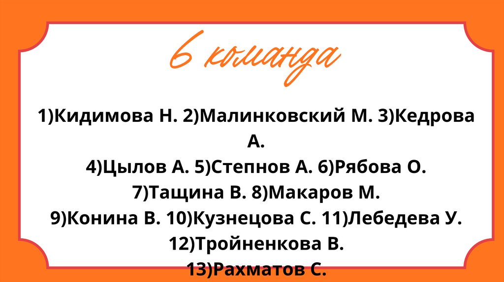 1)Отарбаев А. 2)Котельникова О. 3)Семенов А.4)Казакова У.5)Харламова А.6)Курчаева А.
