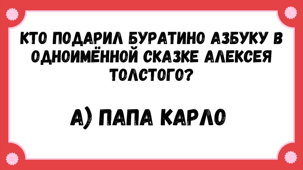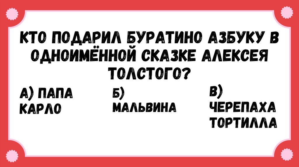 КТО ПОДАРИЛ БУРАТИНО АЗБУКУ ВОДНОИМЁННОЙ СКАЗКЕ АЛЕКСЕЯ