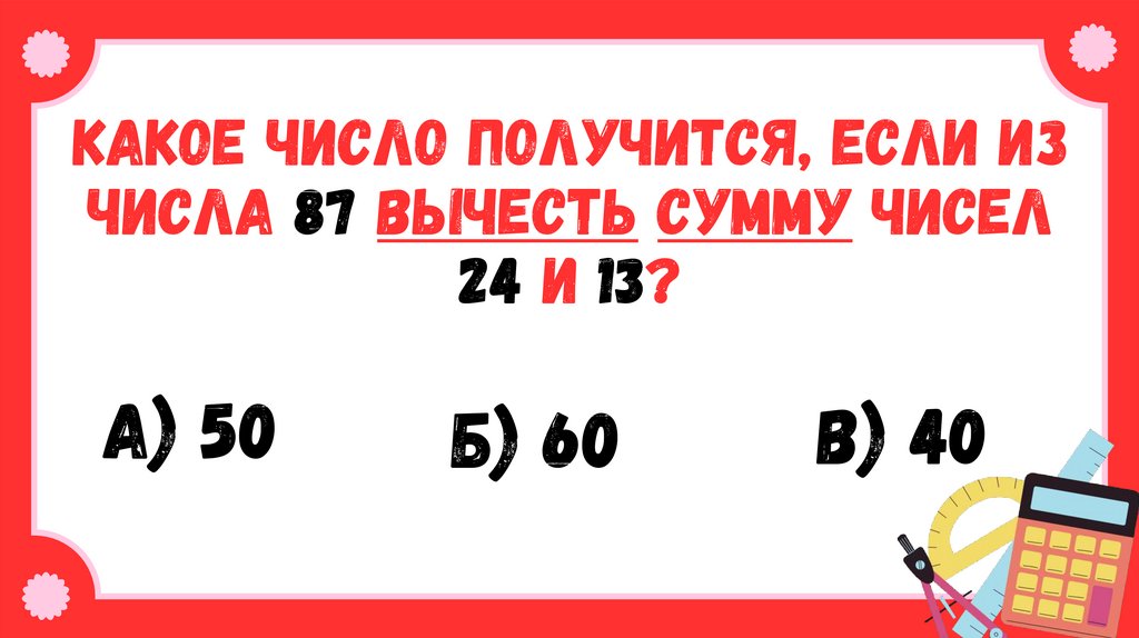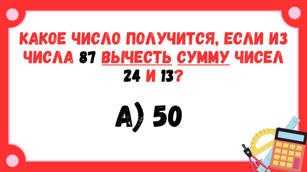 КАКОЕ ЧИСЛО ПОЛУЧИТСЯ, ЕСЛИ ИЗЧИСЛА 87 ВЫЧЕСТЬ СУММУ ЧИСЕЛ