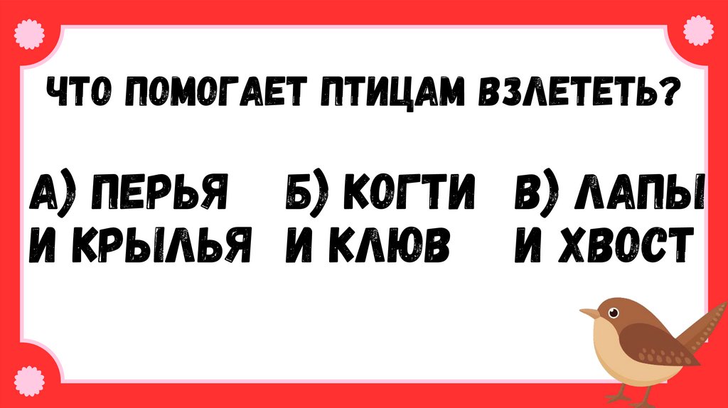 ЧТО ПОМОГАЕТ ПТИЦАМ ВЗЛЕТЕТЬ?А) Перья Б) Когти В) Лапы