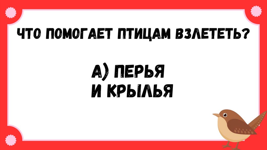 ЧТО ПОМОГАЕТ ПТИЦАМ ВЗЛЕТЕТЬ?А) Перья