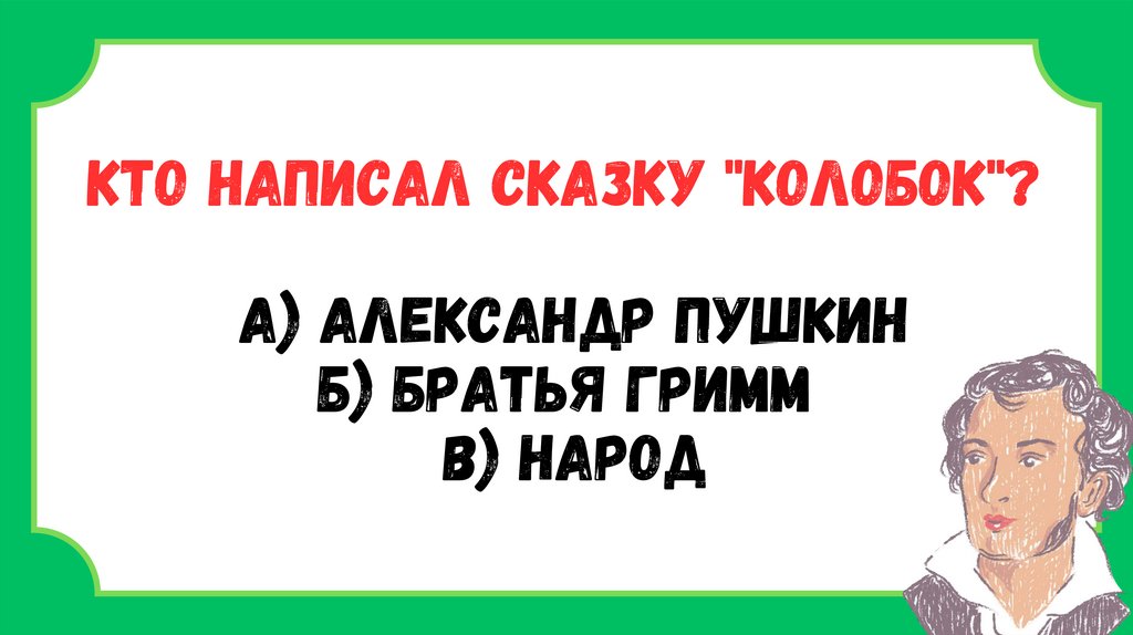 КТО НАПИСАЛ СКАЗКУ "КОЛОБОК"?А) Александр Пушкин