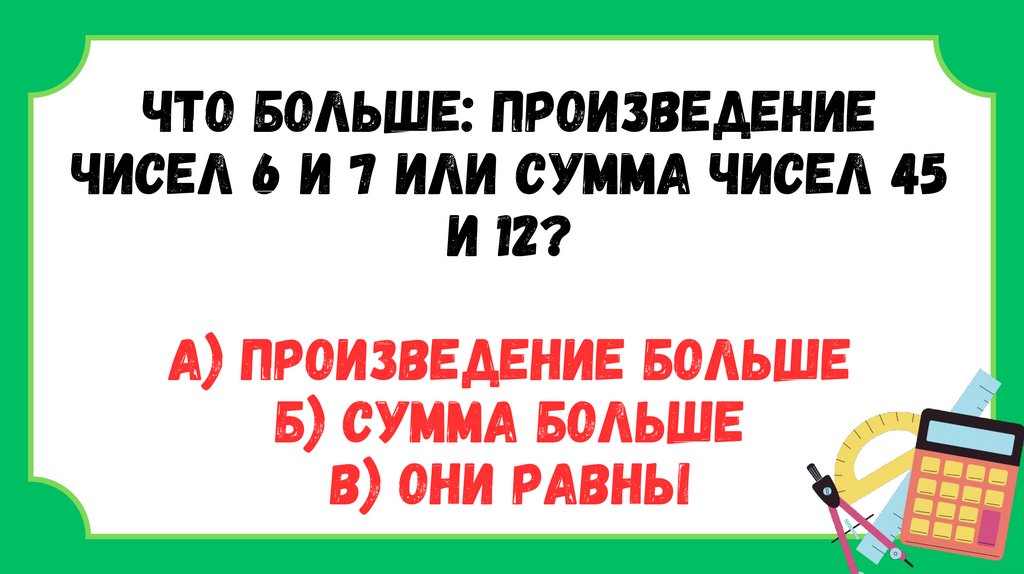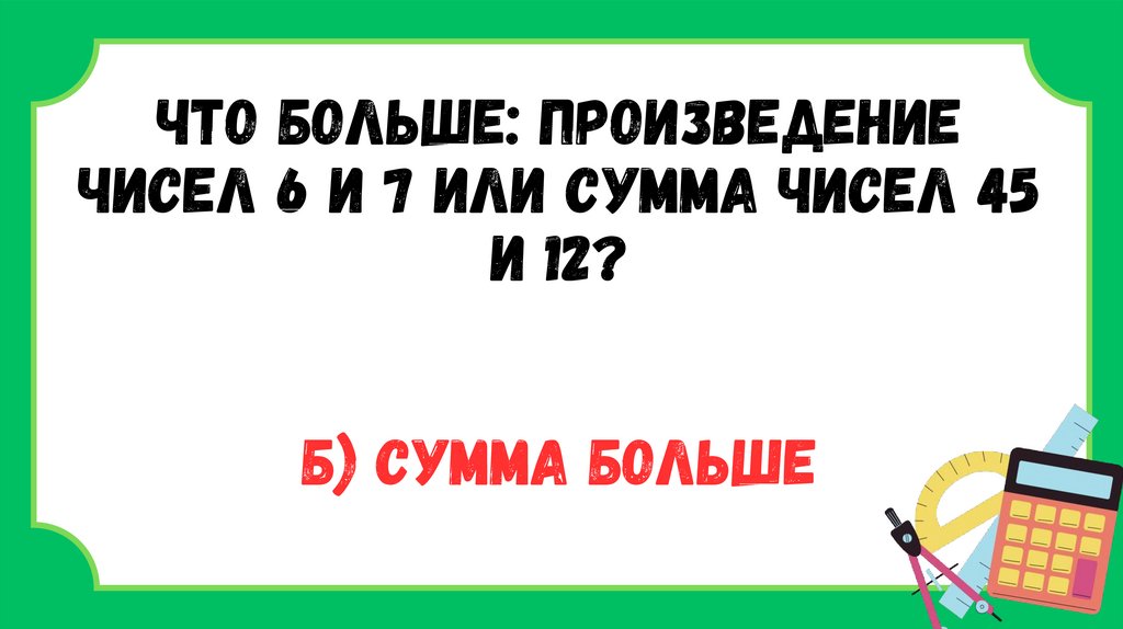 ЧТО БОЛЬШЕ: ПРОИЗВЕДЕНИЕЧИСЕЛ 6 И 7 ИЛИ СУММА ЧИСЕЛ 45