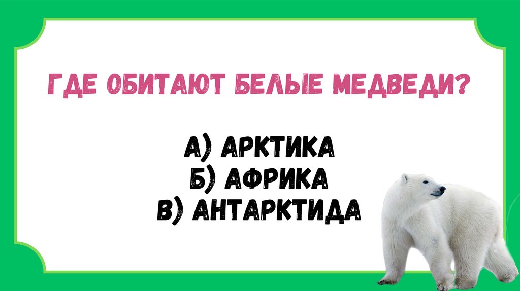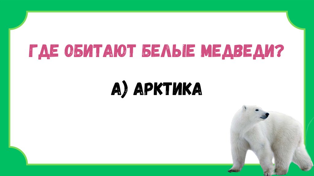 ГДЕ ОБИТАЮТ БЕЛЫЕ МЕДВЕДИ?А) Арктика