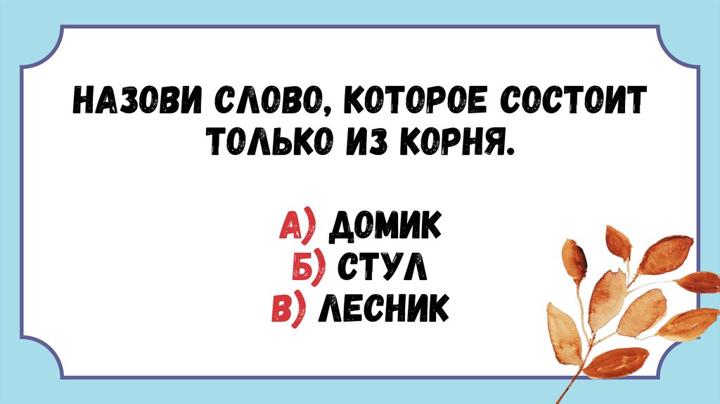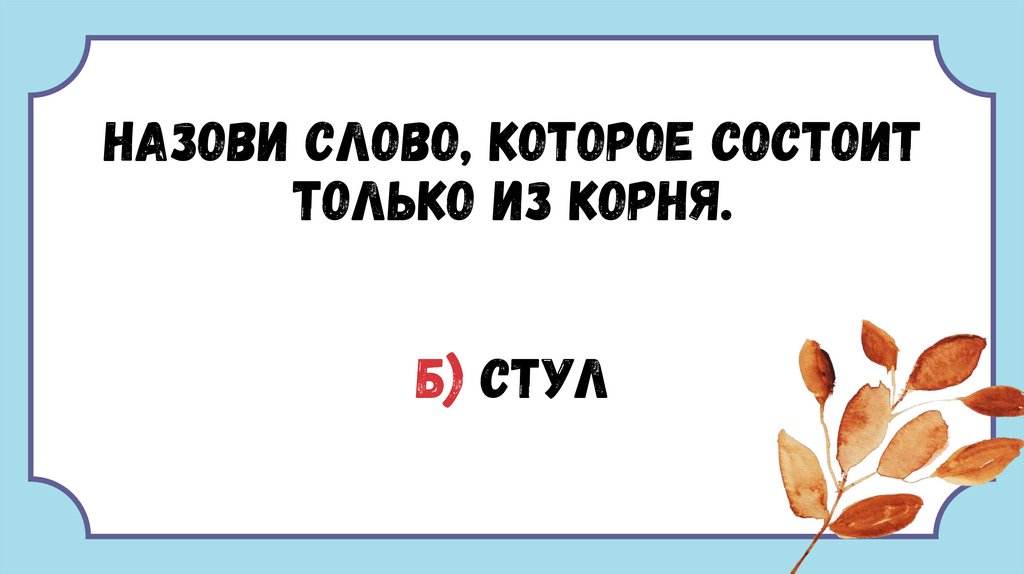 НАЗОВИ СЛОВО, КОТОРОЕ СОСТОИТТОЛЬКО ИЗ КОРНЯ.