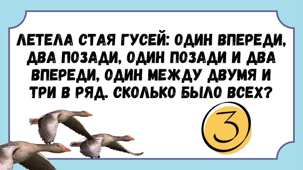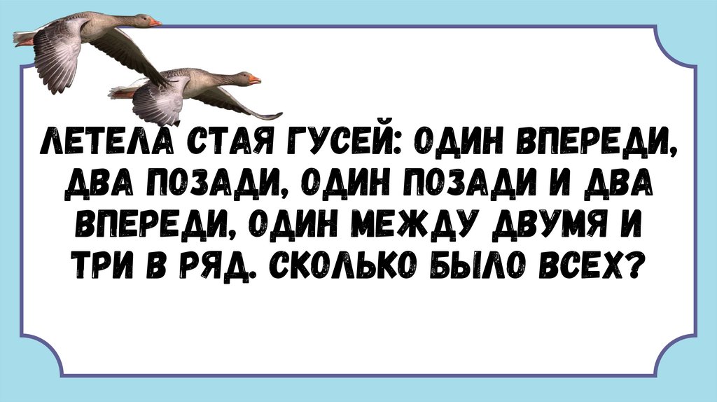 ЛЕТЕЛА СТАЯ ГУСЕЙ: ОДИН ВПЕРЕДИ,ДВА ПОЗАДИ, ОДИН ПОЗАДИ И ДВА