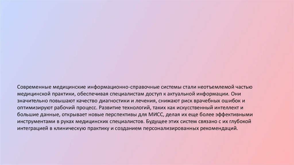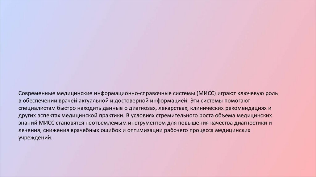 Современные медицинские информационно-справочные системы стали неотъемлемой частьюмедицинской практики, обеспечивая специалистам доступ к актуальной информации. Они