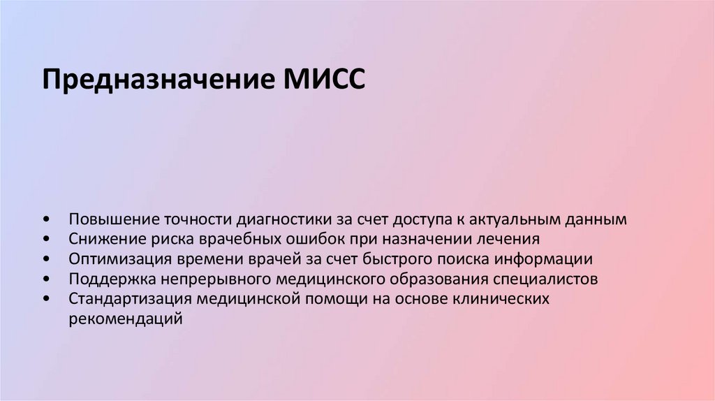 Предназначение МИССПовышение точности диагностики за счет доступа к актуальным данным