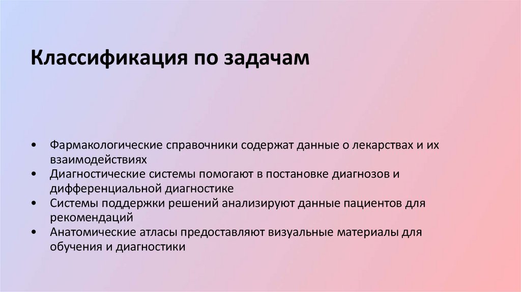 Классификация по задачамФармакологические справочники содержат данные о лекарствах и их
