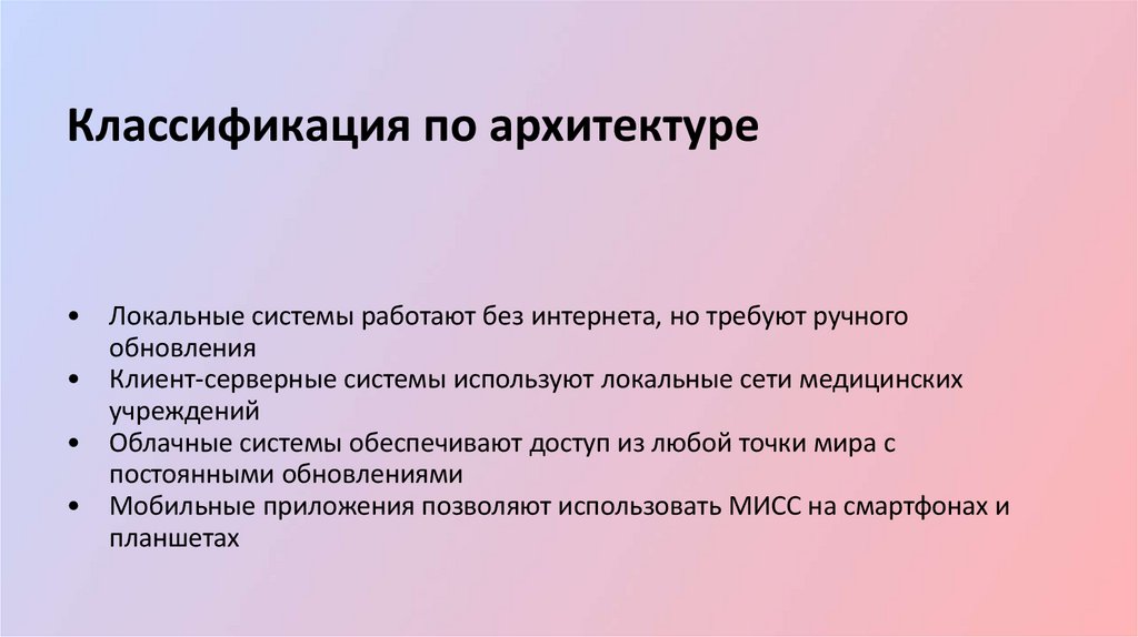 Классификация по архитектуреЛокальные системы работают без интернета, но требуют ручного