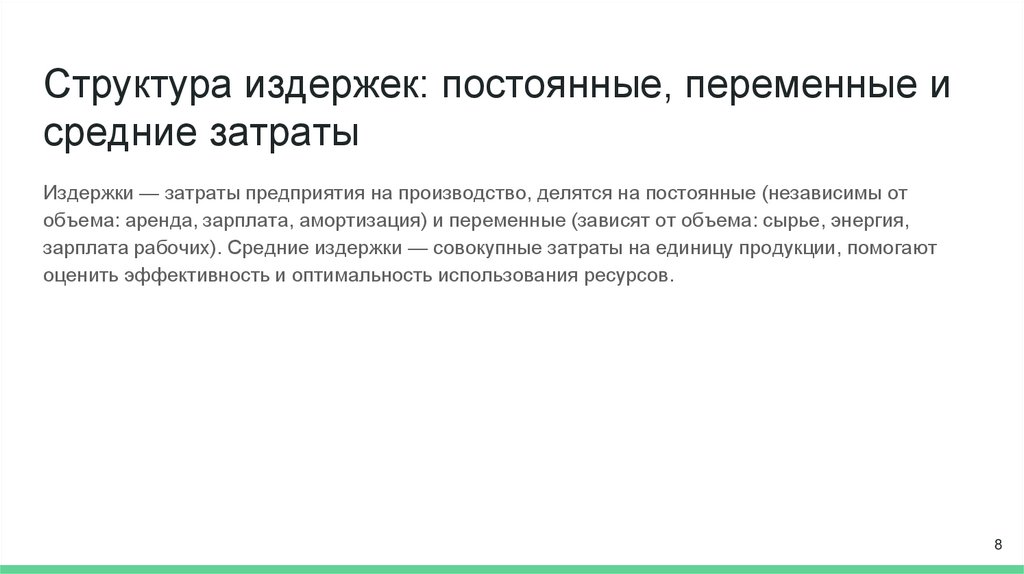 зарплата рабочих). Средние издержки — совокупные затраты на единицу продукции, помогают