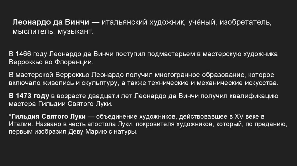 В 1473 году в возрасте двадцати лет Леонардо да Винчи получил квалификацию