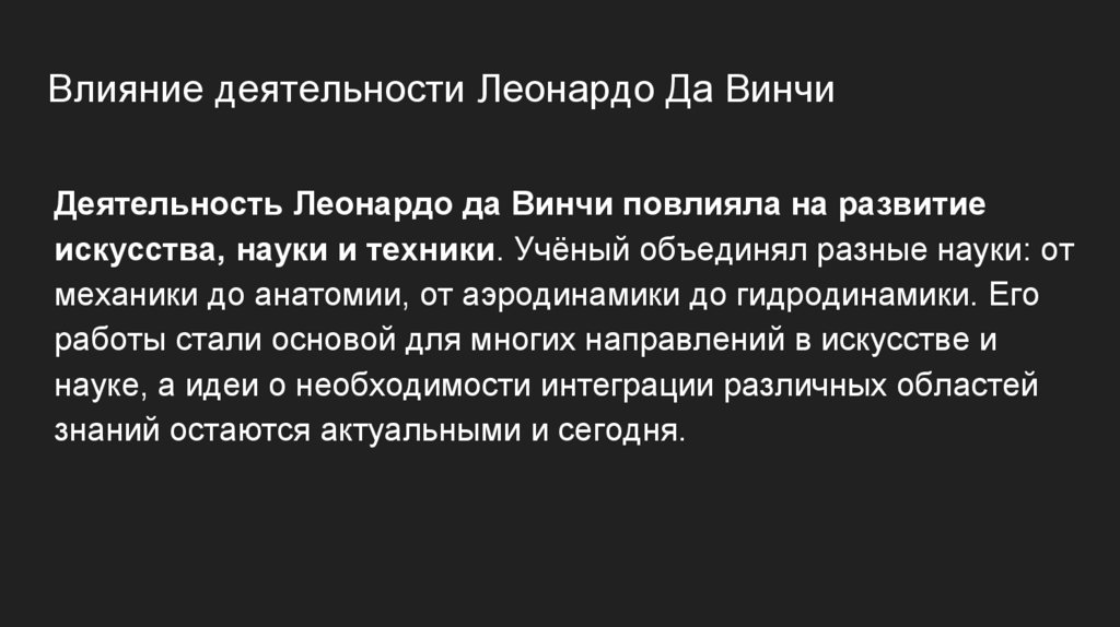 Влияние деятельности Леонардо Да ВинчиДеятельность Леонардо да Винчи повлияла на развитие
