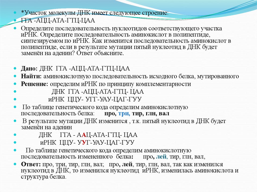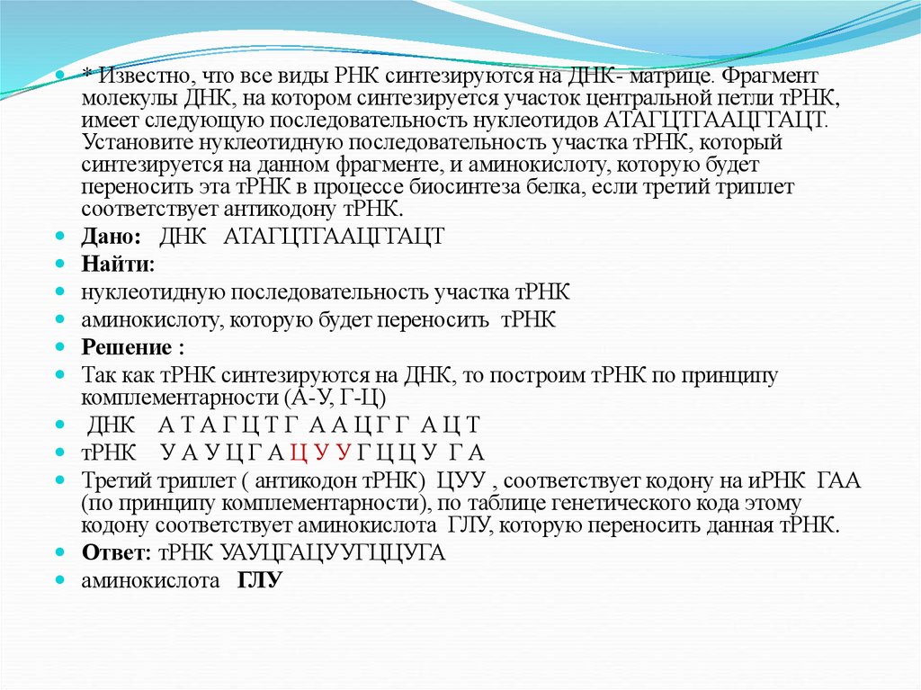 7. Первый тип задач - задачи на установление последовательности нуклеотидов в ДНК, иРНК, антикодонов тРНК