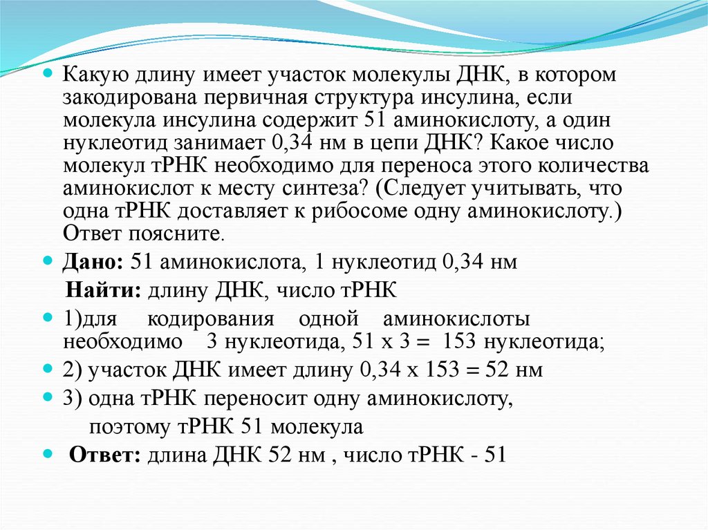 Какую длину имеет участок молекулы ДНК, в которомзакодирована первичная структура инсулина, если