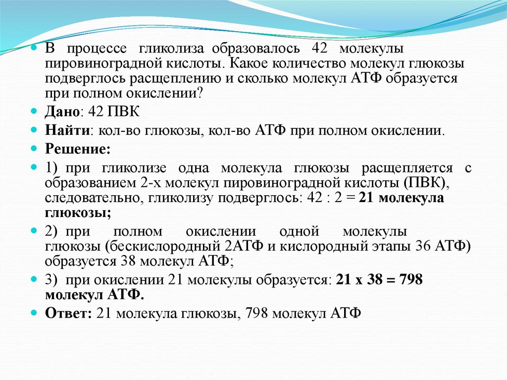 В процессе гликолиза образовалось 42 молекулыпировиноградной кислоты. Какое количество молекул глюкозы