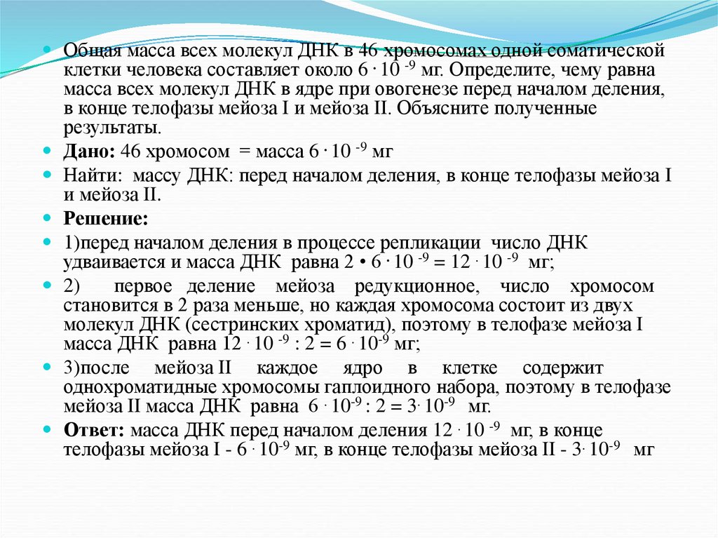 Ответ: масса ДНК перед началом деления 12 . 10 -9 мг, в конце