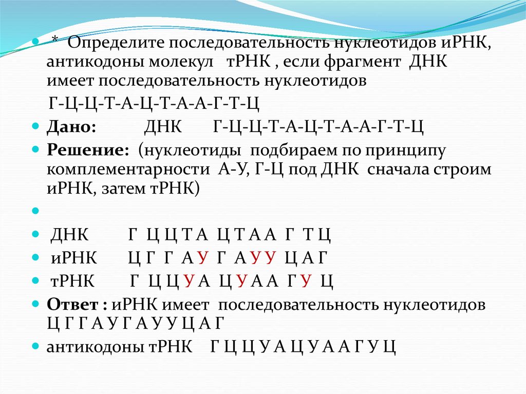 6. Первый тип задач - задачи на установление последовательности нуклеотидов в ДНК, иРНК, антикодонов тРНК