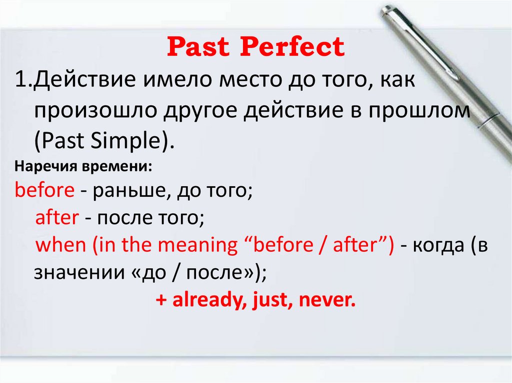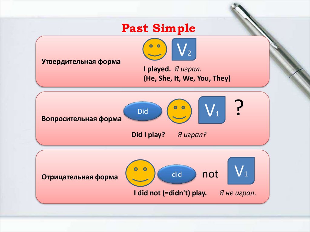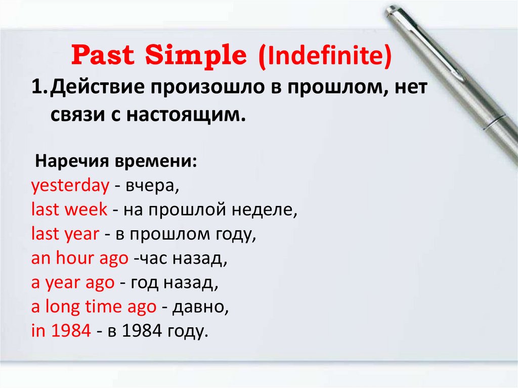 Past Simple (Indefinite)1.Действие произошло в прошлом, нет