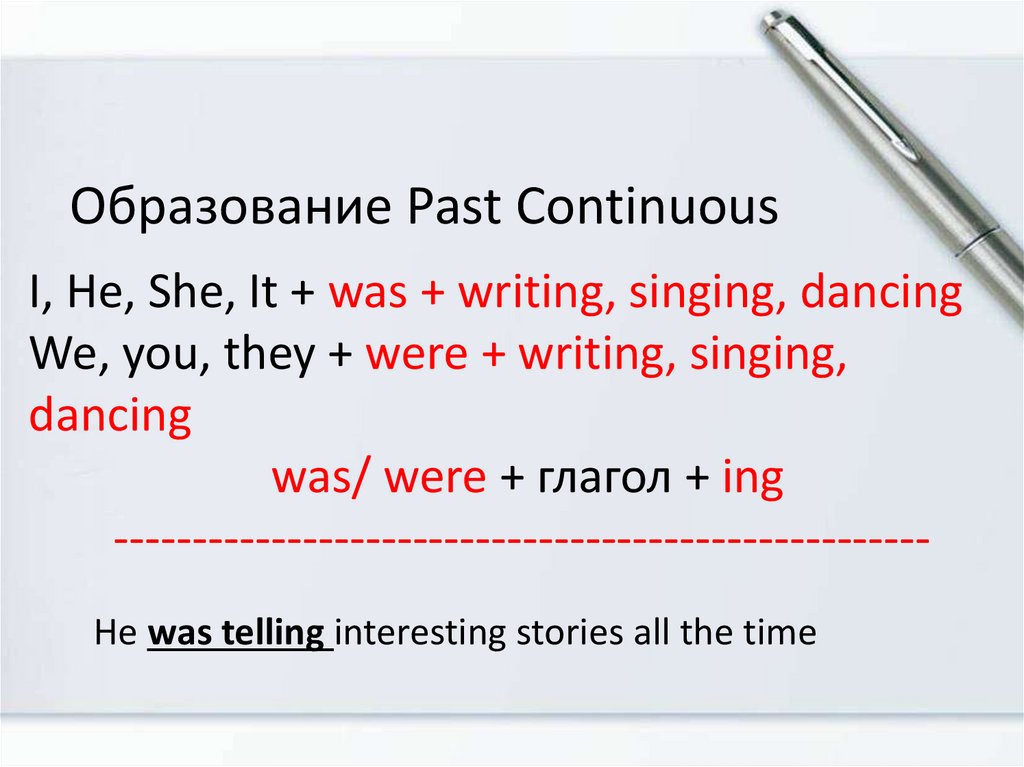 Образование Past ContinuousI, He, She, It + was + writing, singing, dancing