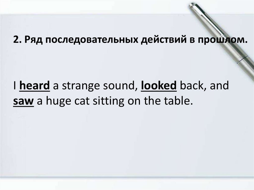 2. Ряд последовательных действий в прошлом.I heard a strange sound, looked back, and