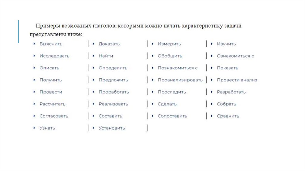 Всегда начинается с ГЛАГОЛА (описывается основное действие «рассмотреть»,