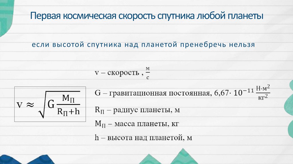 Первая космическая скорость спутника любой планетыесли высотой спутника над планетой пренебречь нельзя