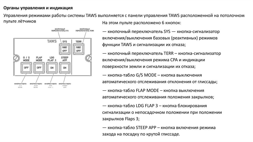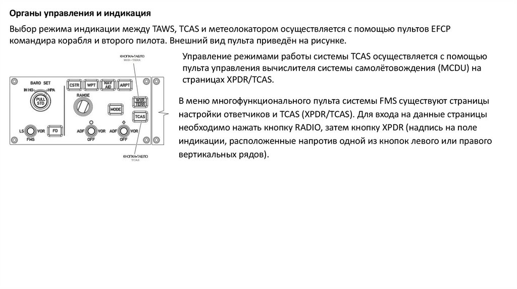Органы управления и индикацияВыбор режима индикации между TAWS, TCAS и метеолокатором осуществляется с помощью пультов EFCP