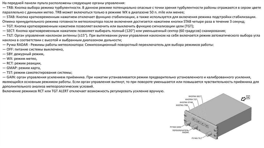 На передней панели пульта расположены следующие органы управления:— TRB: Кнопка выбора режима турбулентности. В данном режиме потенциально опасные с точки зрения турбулентности районы отражаются в сером цвете