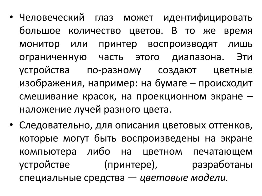 • Человеческий глаз может идентифицироватьбольшое количество цветов. В то же время