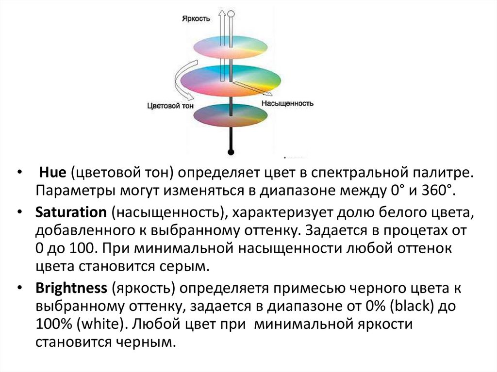 • Brightness (яркость) определяетя примесью черного цвета к