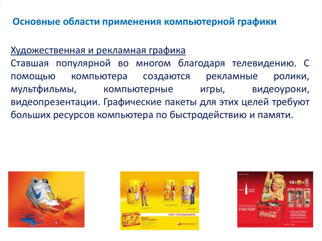Основные области применения компьютерной графикиХудожественная и рекламная графика